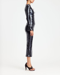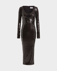 The Solaria dress is cut from subtle sheer sequin fabric in dark chocolate, lined with mesh for comfort and a gently cinched fit. Fitted through the body, it has long sleeves and a skirt that falls just below the knees. A cut-out at the neckline is laced with a branded metal-tipped cord, creating a functional, material accent. MORE DETAILS Designed for a slim fit. The model is 5'10" (178cm) and wears a UK 8. - Composition: Main:100% Polyester, Lining: 85% Nylon 15% Spandex - Care: Professional Dry Clean Only - Made in GREAT BRITAIN. Style number: D-MD-220-SS26-02