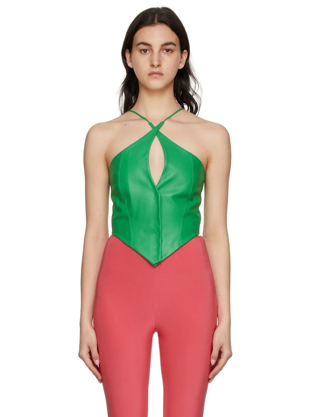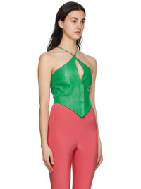 Grained faux-leather tank top. · Halter neck strap · Concealed press-stud closure at front · Asymmetric cropped hem · Fully lined Available exclusively at SSENSE. Supplier color: Green 100% polyester. Made in United Kingdom 221427F111014