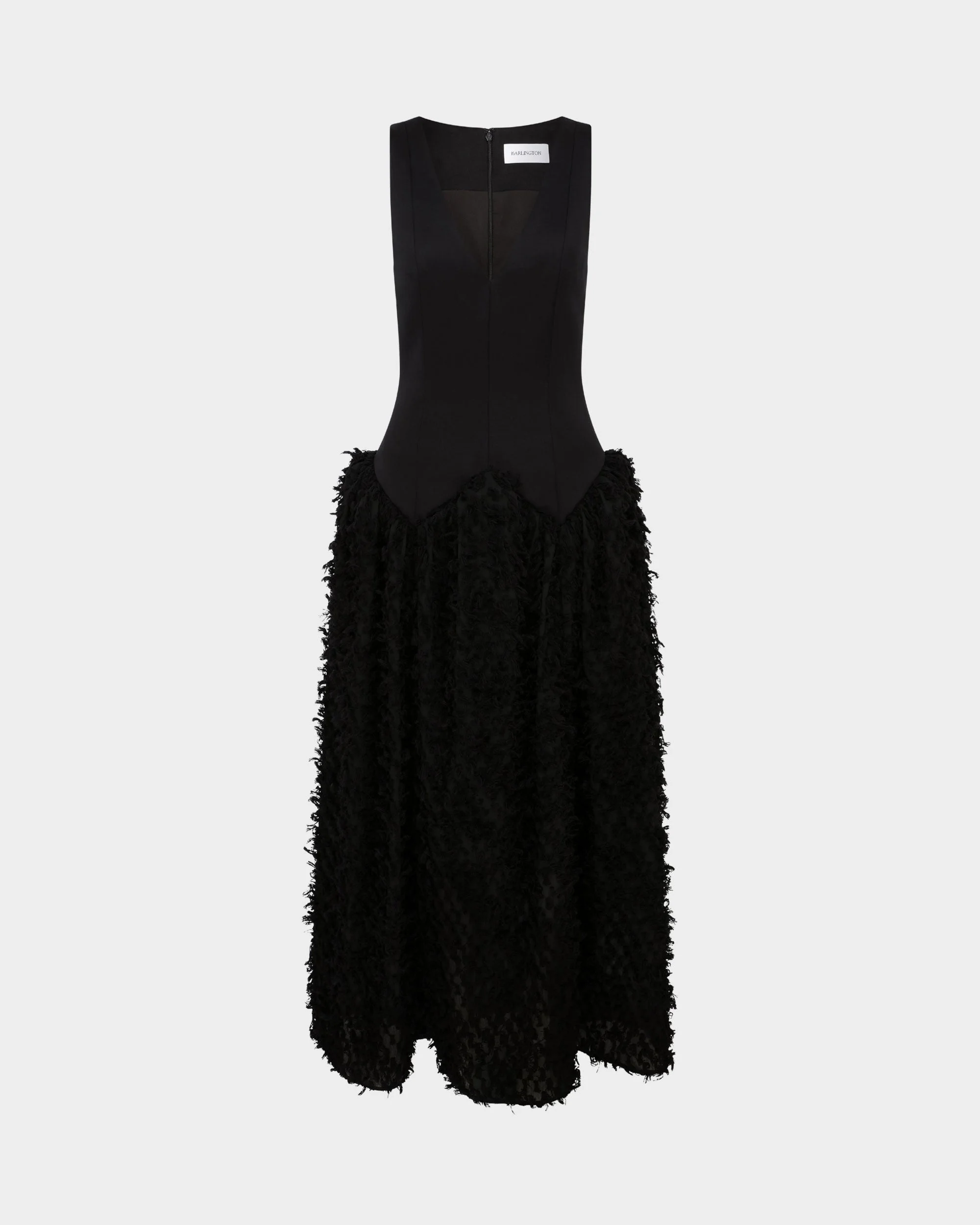 The Tonye Midi Dress is a refined, tailored silhouette that balances structure with texture. It features a sharp V-neckline and a subtly scalloped waist that flatters the form. The skirt is crafted from textured jacquard cotton, adding depth and dimension to the clean lines of its design. MORE DETAILS Designed for a regular fit. The model is 5'11" (180cm) and wears a UK 8. - Main: 61% Wool 39% Cotton - Contrast: 40% Cotton, 32% Viscose, 11% Polycotton, 17% Polyester - Lining: 100% Recycled Polyester - Care: Professional dry clean only - Made in Portugal. Style number: D-MD-646-AW25-01