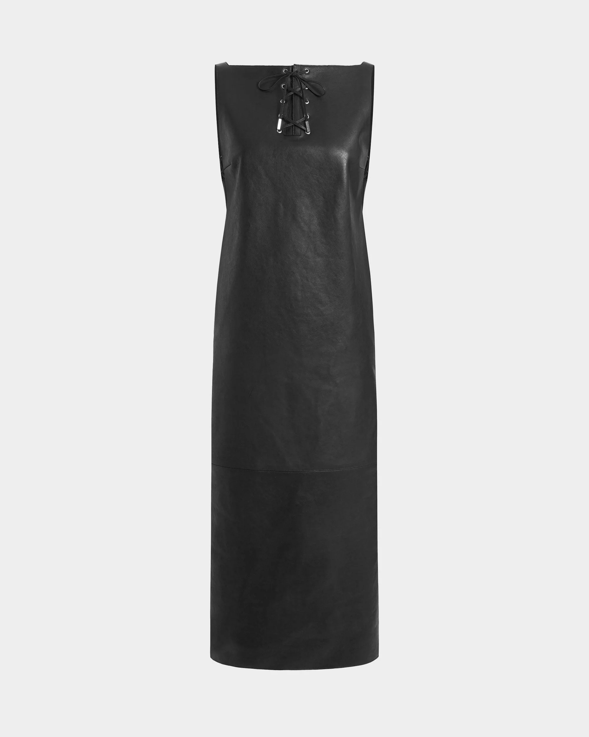 The True dress is made from supple dark chocolate leather, designed in a sleeveless shift silhouette with a boat neckline and a fully open back. At the back, the straps are secured with branded metal-tipped cord laces, a detail echoed at the front of the neck. The dress falls below the knees, with a centre-back vent and concealed side pockets for a clean, effortless finish. MORE DETAILS Designed for a regular fit. The model is 5'11" (180cm) and wears a UK 8. - Composition: Main: 100% Lambskin, Lining: 100% Viscose - Care: Professional Leather Clean Only - Made in GREAT BRITAIN. Style number: D-MD-719-SS26-01 LEATHER NERO