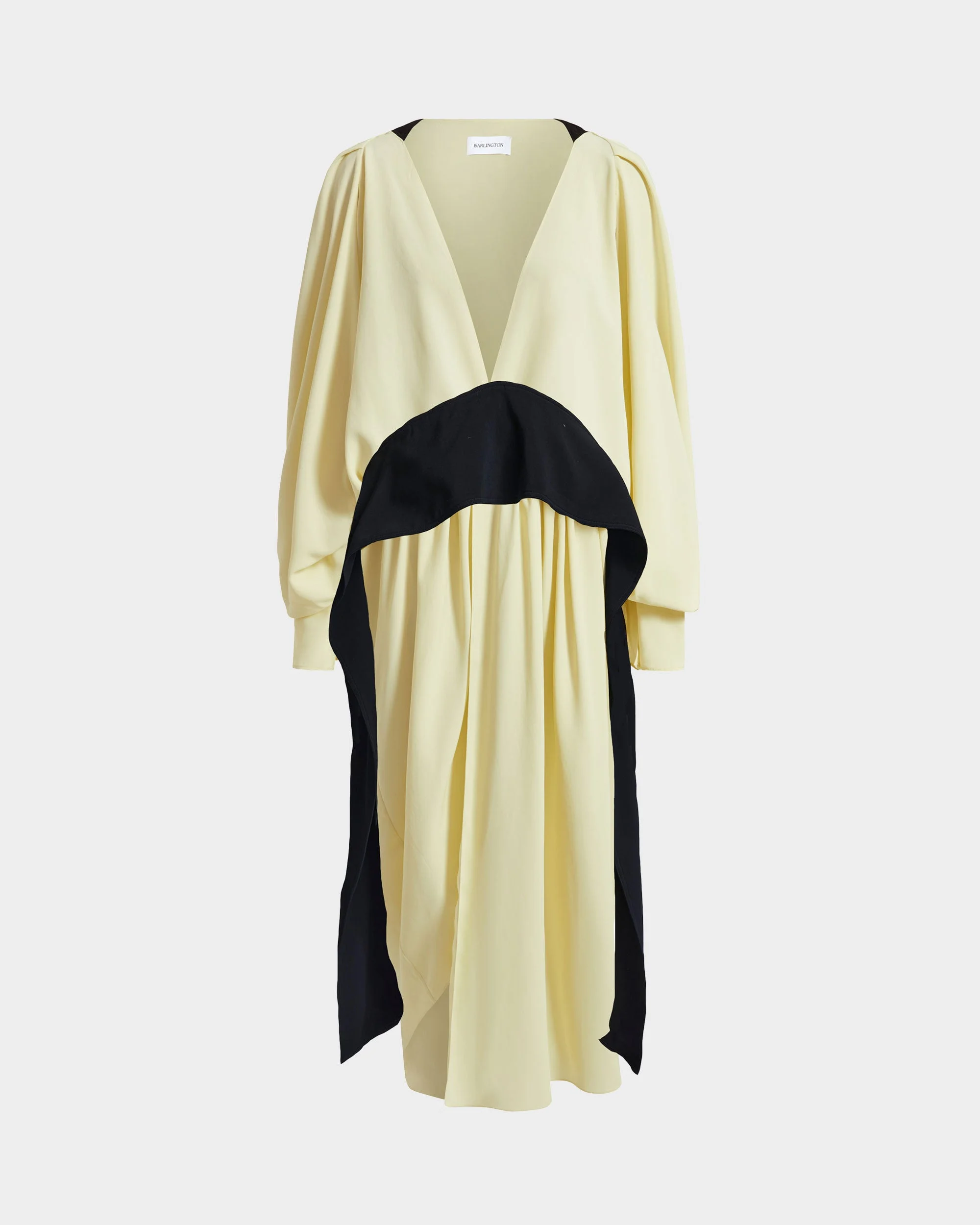 The Tilde Dress features long balloon sleeves with cuffs and inner arm slits, a deep V neckline, and a ruched waist panel. Cut from soft crepe in buttery yellow with contrasting black panels, it has a draped silhouette throughout. Featured as Look 3 on the SS25 runway, this design reflects the season’s relaxed aesthetic. MORE DETAILS Designed for a relaxed fit. The model is 5'9.5" (176cm) and wears a UK 8. - Outer: Viscose 100% - Lining: Polyester 100% - Care: Cool wash or dry clean - Made in Portugal Style number: D-MD-609-SS25-01