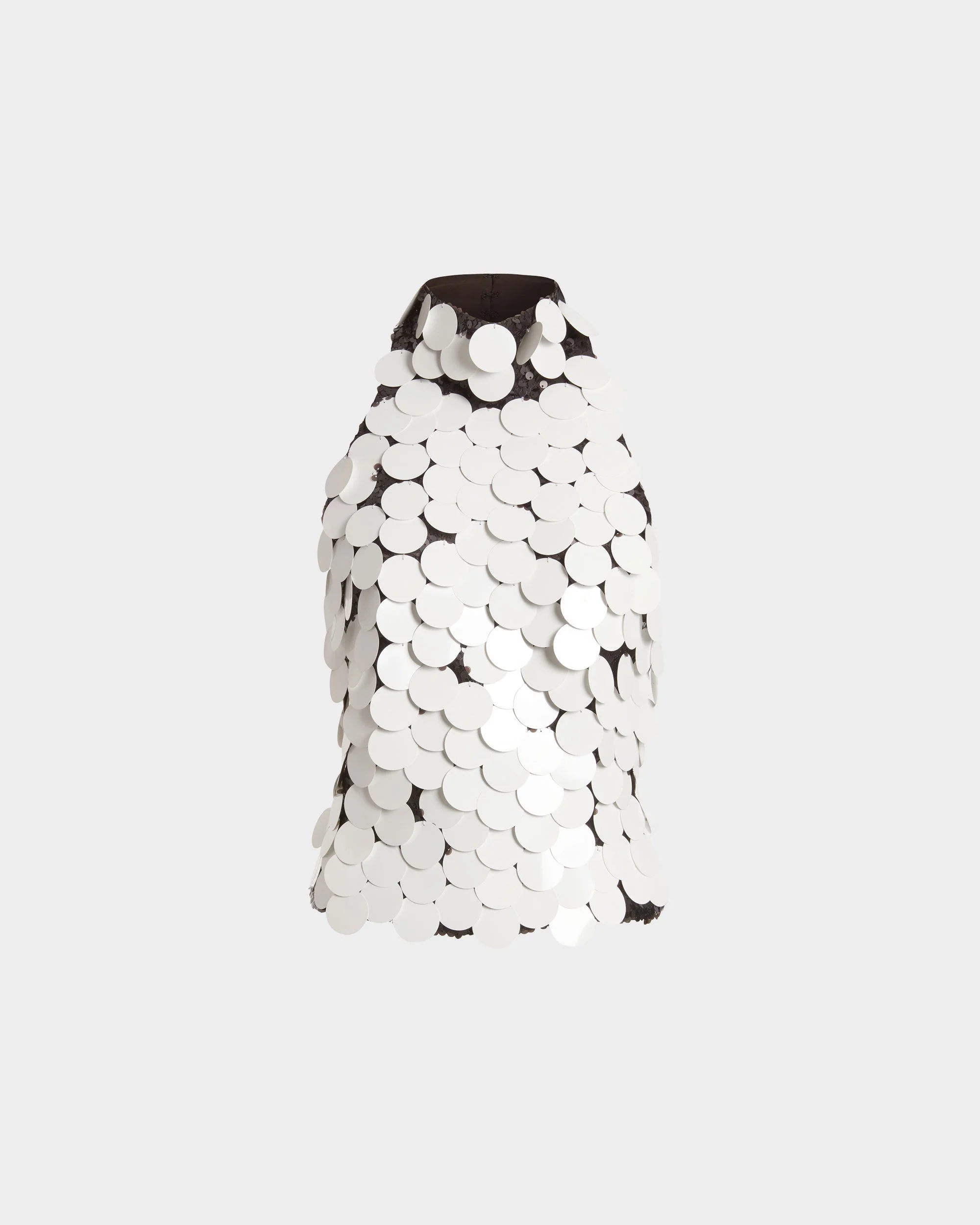 The Ula top is made from dark chocolate sequin fabric, layered with hand-embroidered large white palette sequins for a textured, three-dimensional effect. The silhouette features an elegant halter neckline and an open back, combining meticulous craftsmanship with a clean, refined form. MORE DETAILS Designed for a regular fit. The model is 5'10" (178cm) and wears a UK 8. - Composition: Main: 100% Polyester - Care: Professional Dry Clean Only - Made in GREAT BRITAIN. Style number: T-443-SS26-01