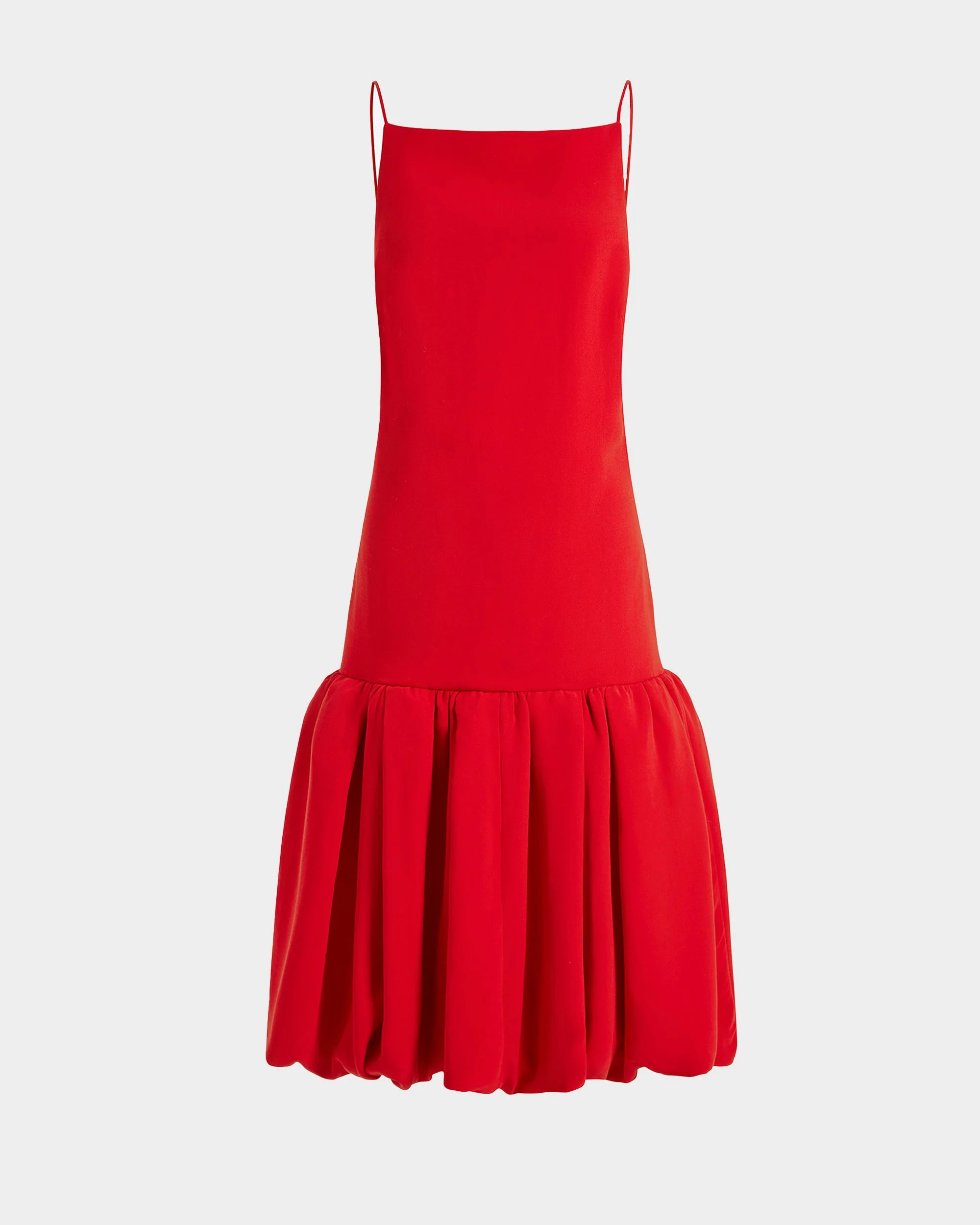Viana Midi Dress in vibrant red crepe features a square neckline, low-cut back, and delicate spaghetti straps. The clean-lined bodice is defined by a drop waist, while a pleated puff hem adds volume and structure. MORE DETAILS Designed for a slim fit. The model is 5'11" (180cm) and wears a UK 8 - Main: 100% Polyester - Lining: 100% Recycled Polyester - Care: Dry cleaning only, iron a low temperature - Made in Great Britain Style number: D-MD-659-AW25-02