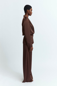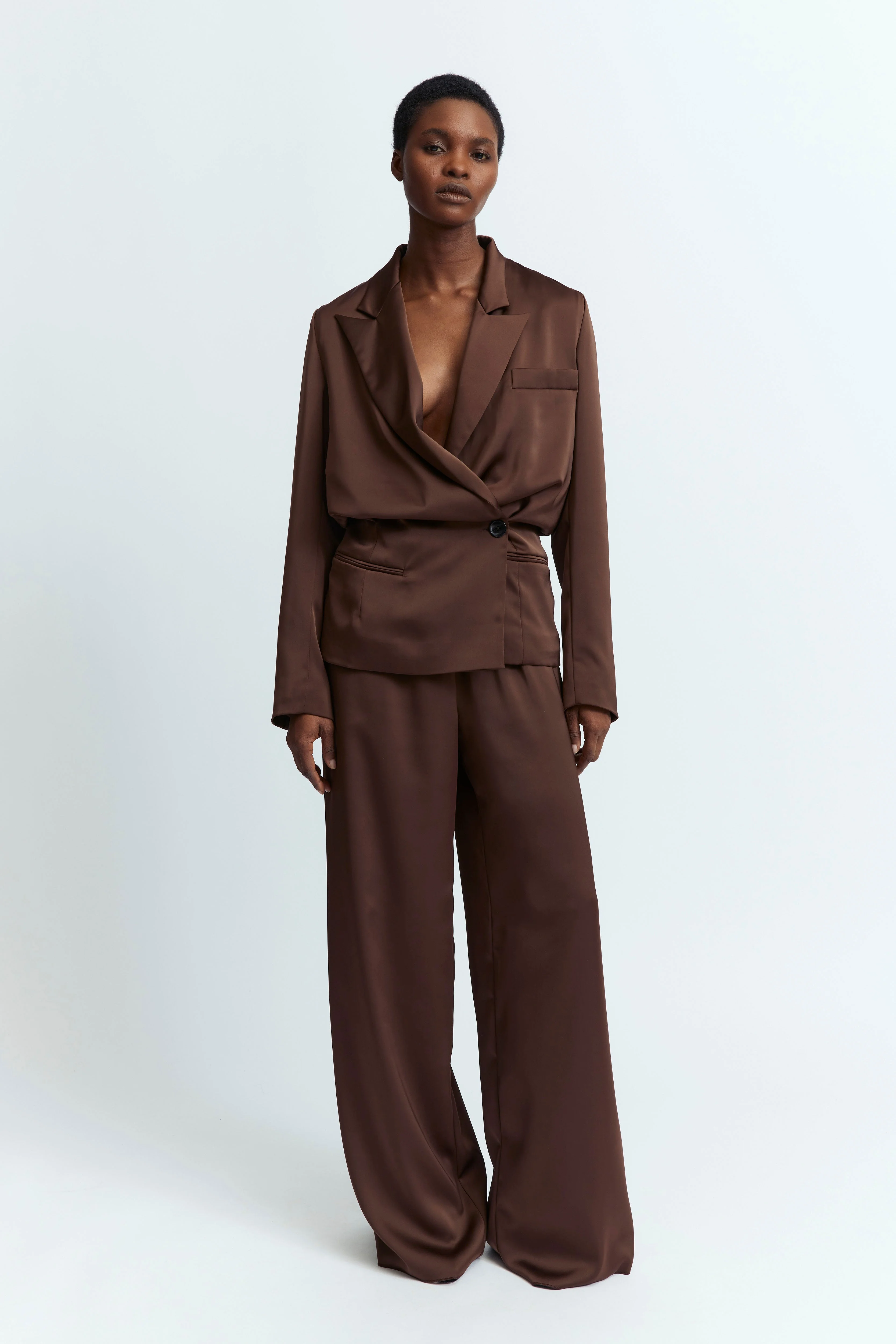 The Argo Trouser is a wide-leg design cut from fluid, lustrous satin for effortless movement. It features an elasticated waistband, concealed hip pockets, and precise waist darts for subtle structure. Styled with the matching Ardo Jacket, this piece offers a refined yet relaxed take on modern tailoring. MORE DETAILS Designed for a relaxed fit. The model is 5'9.5" (176cm) and wears a UK 8. - Outer: Polyester 100% - Lining: Recycled Polyester 100% - Care: Hand wash or dry clean - Made in Portugal Style number: TR-110-SS25-01