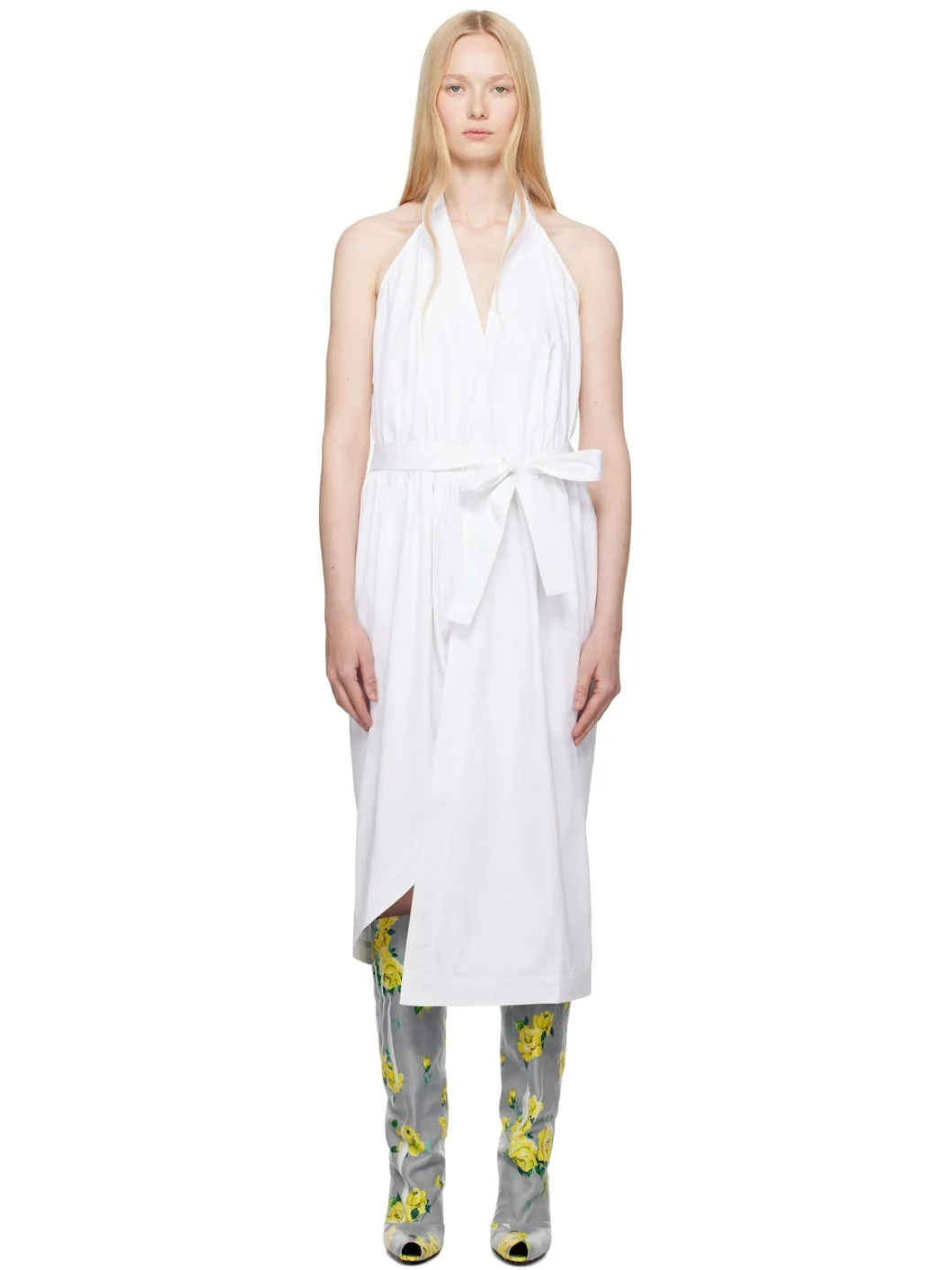 Cotton poplin midi dress. Draping throughout. · Plunging V-neck · Ruching at elasticized waist · Detachable self-tie belt · Seam pockets · Slit at asymmetric hem · Self-tie halter strap Supplier color: White 100% cotton. Made in Portugal 251427F054012