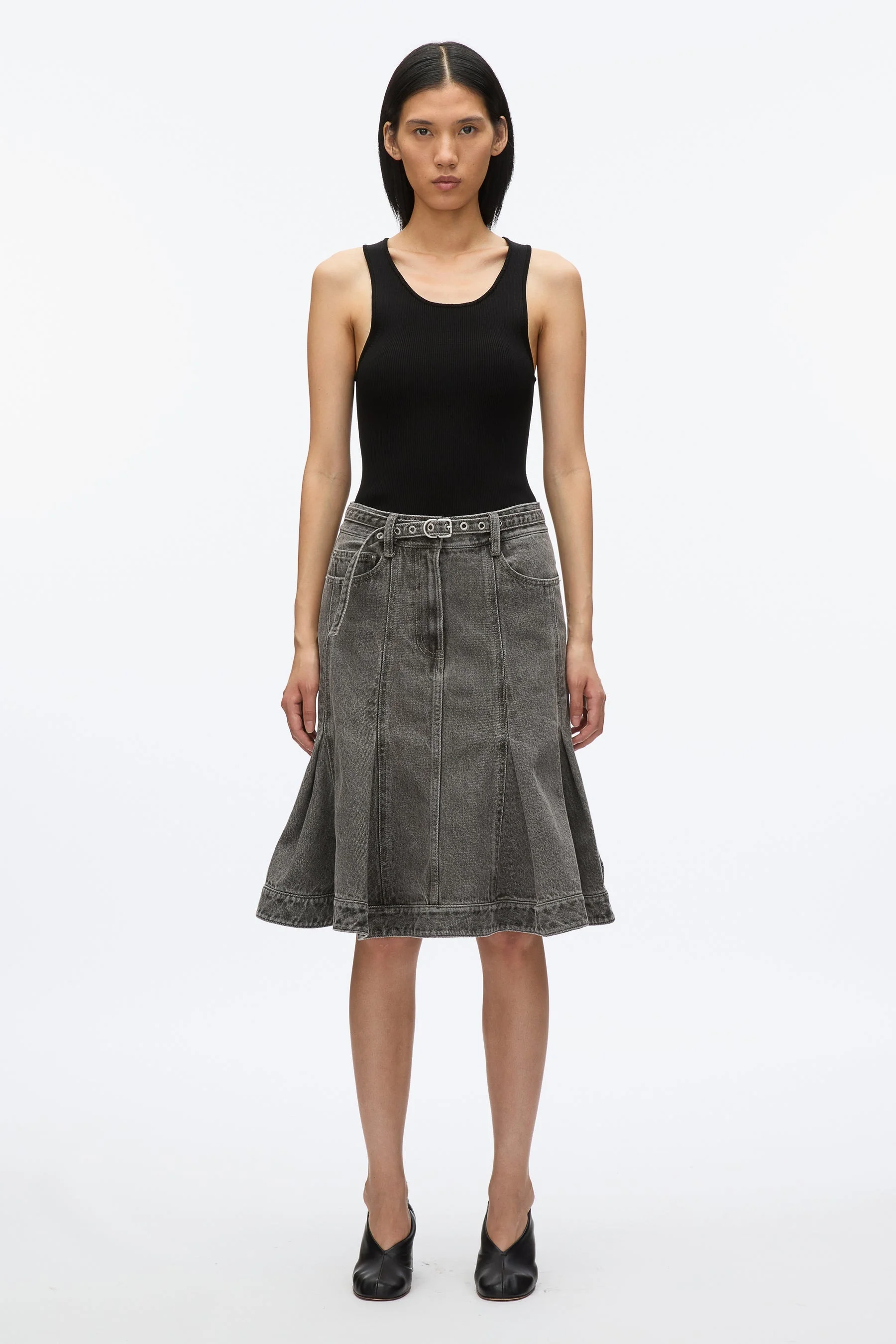 Flounce Hem Belted Denim Skirt