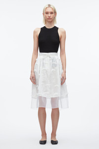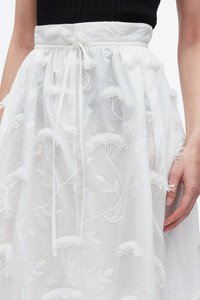 A romantic statement with a grounded sensibility. This midi skirt is crafted from delicate fil coupe embroidery on airy cotton voile, inspired by the natural movement of wheat stalks in the wind. Sheer organza panels add a hint of transparency and volume, creating an ethereal silhouette that floats with every step. Finished with a soft drawstring waist, it’s a piece that balances texture, movement, and ease. Style it with a tucked-in tank for everyday poetry, or lean into full romance with the matching embroidered top. - 100% Cotton - Model is 5'10', Bust: 30', Waist: 23', Hips: 34' and wearing a size 4 - Professional dry clean only