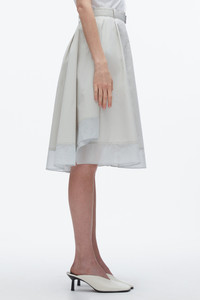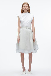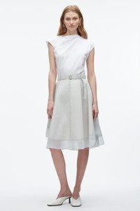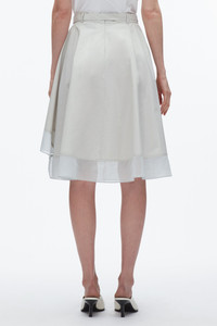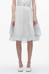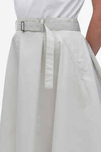 Light as air, but grounded in city life. This A-line skirt is cut from crisp technical poplin and finished with a cotton-silk voile hem that lends subtle translucence and airy movement. An adjustable belt cinches the waist for a custom fit, while the asymmetric overlay adds a sculptural touch. Equal parts romantic and pragmatic—wear it with our Draped Asymmetric Tee for an effortlessly chic, everyday look. - 70% Cotton, 30% Polyester - Model is 5'10', Bust: 30', Waist: 23', Hips: 34' and wearing a size 4 - Professional dry clean only