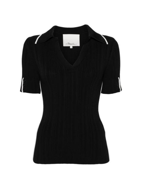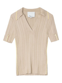 ribbed V-neck top Highlights - Beige - Ribbed knit - V-neck - Short sleeves - Pale yellow side stripes - Button detailing Imported Composition Viscose 73%, Fabric 16%, Polyester 11% Washing instructions Read Manufacturer Guidelines