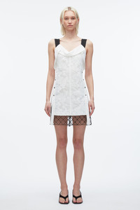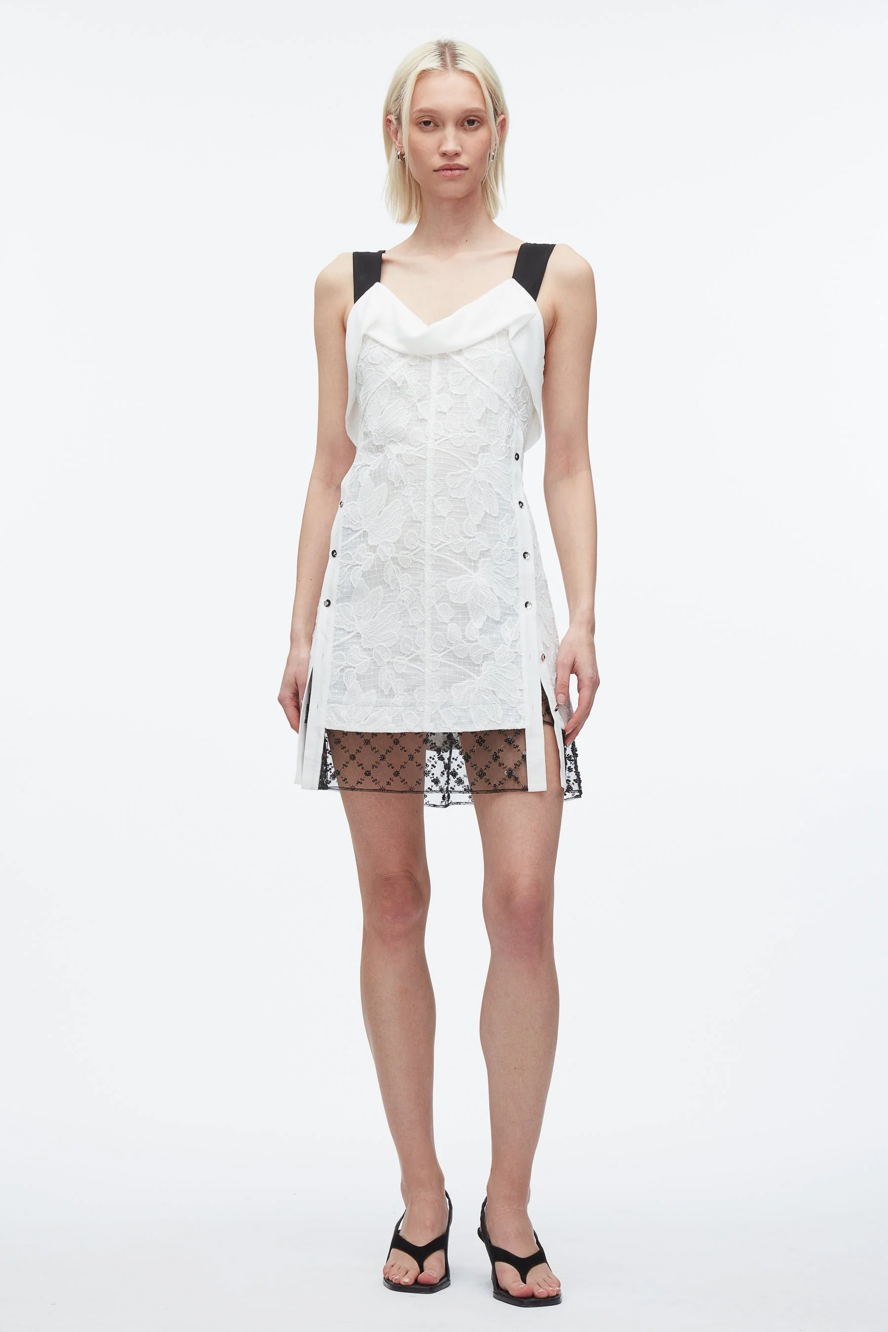 Crafted with layered textures and unexpected contrast, this mini dress reimagines feminine charm with a modern twist. A soft draped neckline meets structured black straps, while sheer floral lace overlays a flirty embroidered tulle hem. Side snap details add a utilitarian edge to its otherwise romantic silhouette. - 100% Polyester - Model is 5'10', Bust: 30', Waist: 23', Hips: 34' and wearing a size 4 - Professional dry clean only