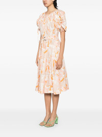 abstract-print gathered-sleeves dress Highlights - Khaki beige - Concealed rear hook and zip fastening - Concealed front button fastening - Two side inset pockets - Adjustable waist strap Imported Composition Lyocell 55%, Cotton 45% SIZE & FIT Model measurements Height 5 ft 10 in(1.77 m) Bust/Chest 31.49 in(80 cm) Hips 35.43 in(90 cm) Waist 25.19 in(64 cm) FittingInformation Designed for a slim fit that sits just away from the body offering a close yet comfortable fit The belt offers adjustability for fitted preferences Made from a midweight non-stretch fabric