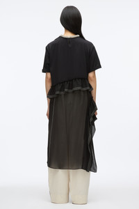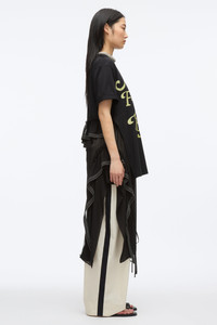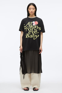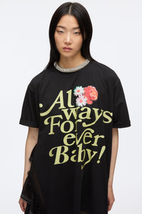 This statement piece merges bold graphics with unexpected elegance. An oversized tee featuring the playful slogan “Always Forever Baby” serves as an ode to our 20th anniversary, paired with a cascading chiffon ruffle skirt detailed with contrast stitching for a modern edge. A crystal-embellished necklace adds a touch of glamour, completing the look. Layer it over denim trousers for a cool, downtown vibe. - 100% Cotton - Model is 5'10', Bust: 30', Waist: 23', Hips: 34' and wearing a size 4 - Professional dry clean only