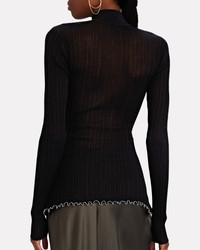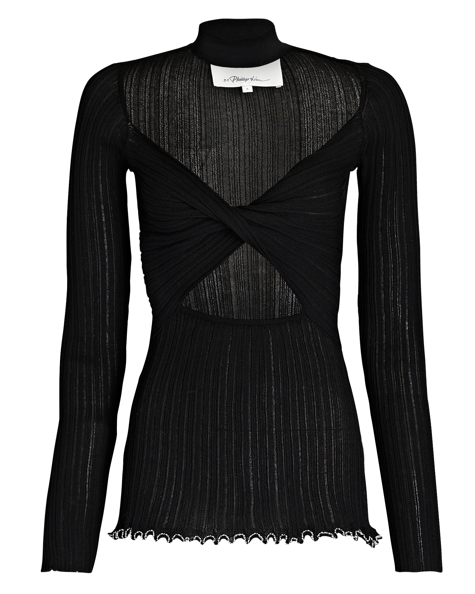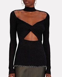 Product Details Spun from a delicate black rib knit, 3.1 Phillip Lim's turtleneck is carved with dramatic front cutouts centered with an elegantly twisted front. Try yours with a satin skirt for sumptuous contrast. - Fabric: 76% cotton, 23% nylon, 1% elastane - Pull-over style - Hand wash cold - Imported - Length from shoulder to hem: 28" - Model is wearing size S - Model height 5'11", bust 33", waist 24.5", hips 34.5"