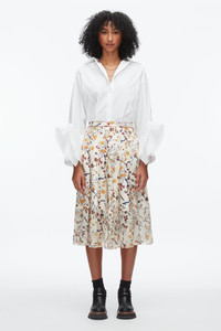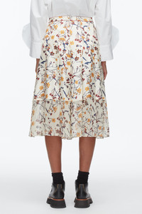Rendered in our seasonal “Bliss Floral” print, this midi skirt blends artful detail with everyday versatility. It’s crafted in a mix of silk twill and silk chiffon for soft structure and subtle sheerness, while contrast blanket-stitching at the waistband adds a tactile finish. Dress it down with boots and a knit or elevate with a crisp shirt for a polished moment. - 100% Silk - Model is 5'10', Bust: 30', Waist: 23', Hips: 34' and wearing a size 4 - Professional dry clean only