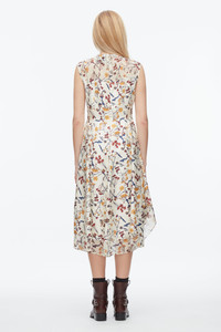 A fresh take on feminine dressing. This sleeveless midi dress features a sheer organza overlay printed with a vibrant wildflower motif. The fit-and-flare silhouette is softly structured with a handkerchief hem finished in a chiffon band that moves with you, while delicate pleats at the neckline add gentle volume. An effortless standout—wear it with boots by day or switch to heels for evening. - 100% Silk - Model is 5'10', Bust: 30', Waist: 23', Hips: 34' and wearing a size 4 - Professional dry clean only