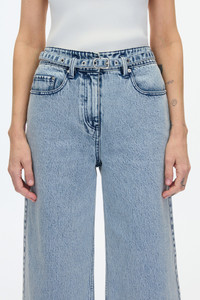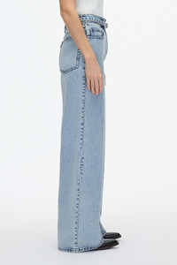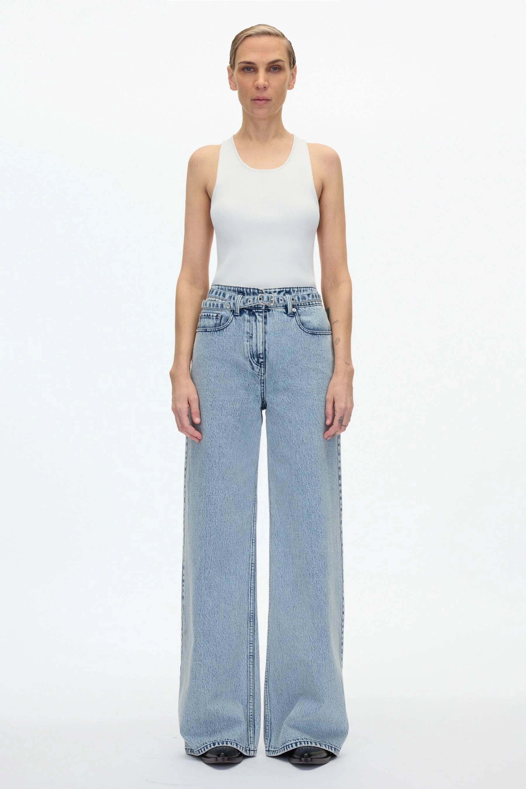 Introducing our Wide Leg jean, designed to sit at the natural waist, snug around hips and slouchy leg. This cool silhouette is universally flatter with an emphasis on elongating the leg. Offered in our Malibu wash, and our signature hardware belt. - 100% Cotton - Model is 5'10', Bust: 30', Waist: 23', Hips: 34' and wearing a size 4 - Professional dry clean only