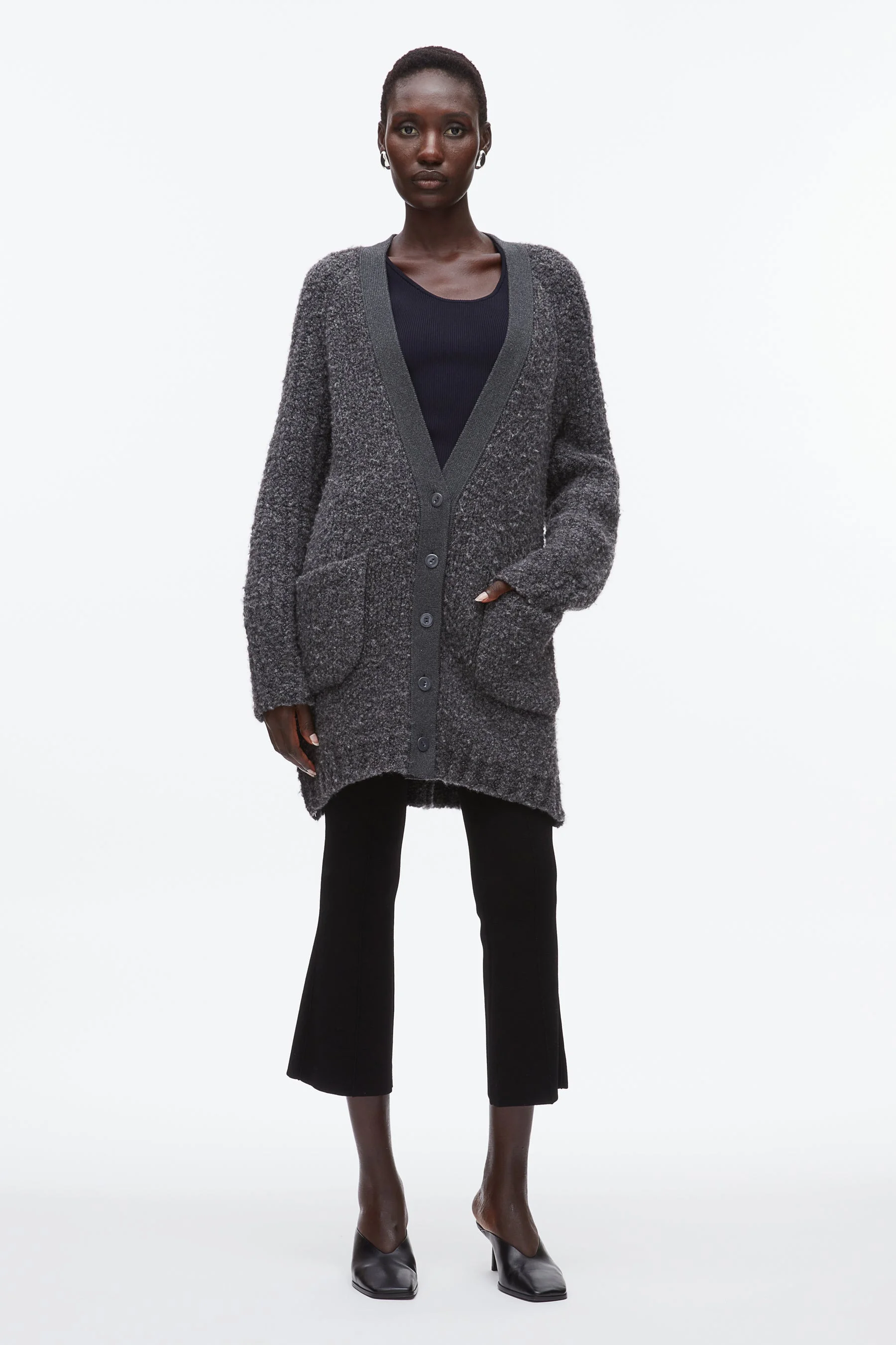 Knit in a cozy wool-blend boucle yarn, this oversized cardigan envelopes you in rich texture and warmth. Ribbed trim outlines the elongated V-neck and button placket, while oversized patch pockets and zippered side vents add a utilitarian twist. Equal parts softness and structure—it’s the kind of piece you’ll reach for on repeat. - 32% Wool, 25% Acrylic, 18% Alpaca, 14% Nylon, 10% Cotton, 1% Elastane - Model is 5'10', Bust: 30', Waist: 23', Hips: 34' and wearing a size 4 - Professional dry clean only