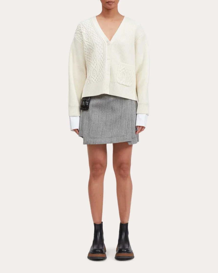 Sure to be a cool-weather staple, this pure wool cardigan features a classic cable knit design, V-neckline, and a patch pocket at the hip. Designer color: ivory Cable knit Patch pocket Front button closure 100% wool Fabric: made in China Professional cleaning Made in China Size & Fit Garment measurements Model wears size S Fits true to size Please note, below measurements reflect Phillip Lim's size chart, not the actual garment. Size XS: 31-32in bust, 25-26in waist, 34-35in hips Size S: 33-34in bust, 27-28in waist, 36-37in hips Size M: 35-46in bust, 29-30in waist, 38-39in hips Size L: 37.5-39in bust, 31.5-33in waist, 40.5-42in hips