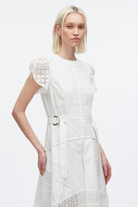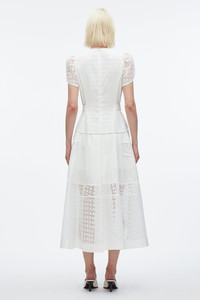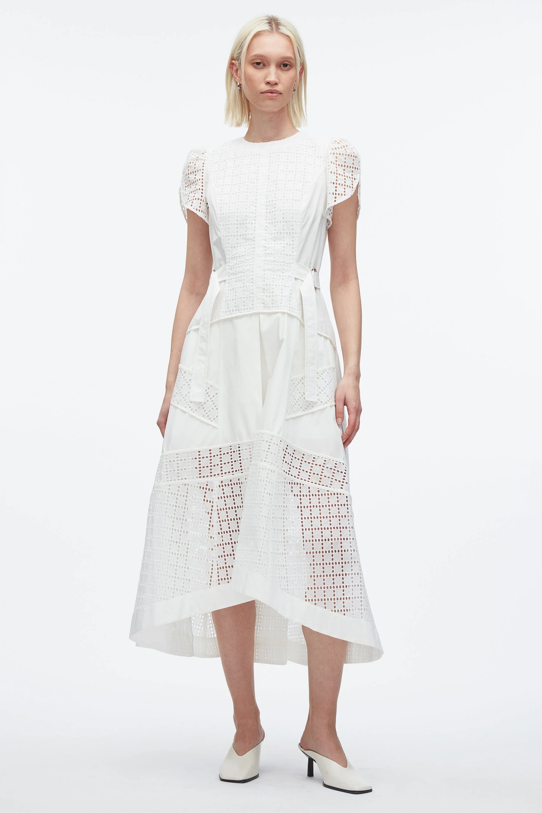 Blending romantic craftsmanship with contemporary design, this flared midi dress features intricate broderie anglaise panels paired with a structured bodice and tulip sleeves for a refined silhouette. Both polished and playful, this dress transitions effortlessly from daytime gatherings to evening occasions, embodying modern femininity with timeless charm. - 100% Cotton - Model is 5'10', Bust: 30', Waist: 23', Hips: 34' and wearing a size 4 - Professional dry clean only