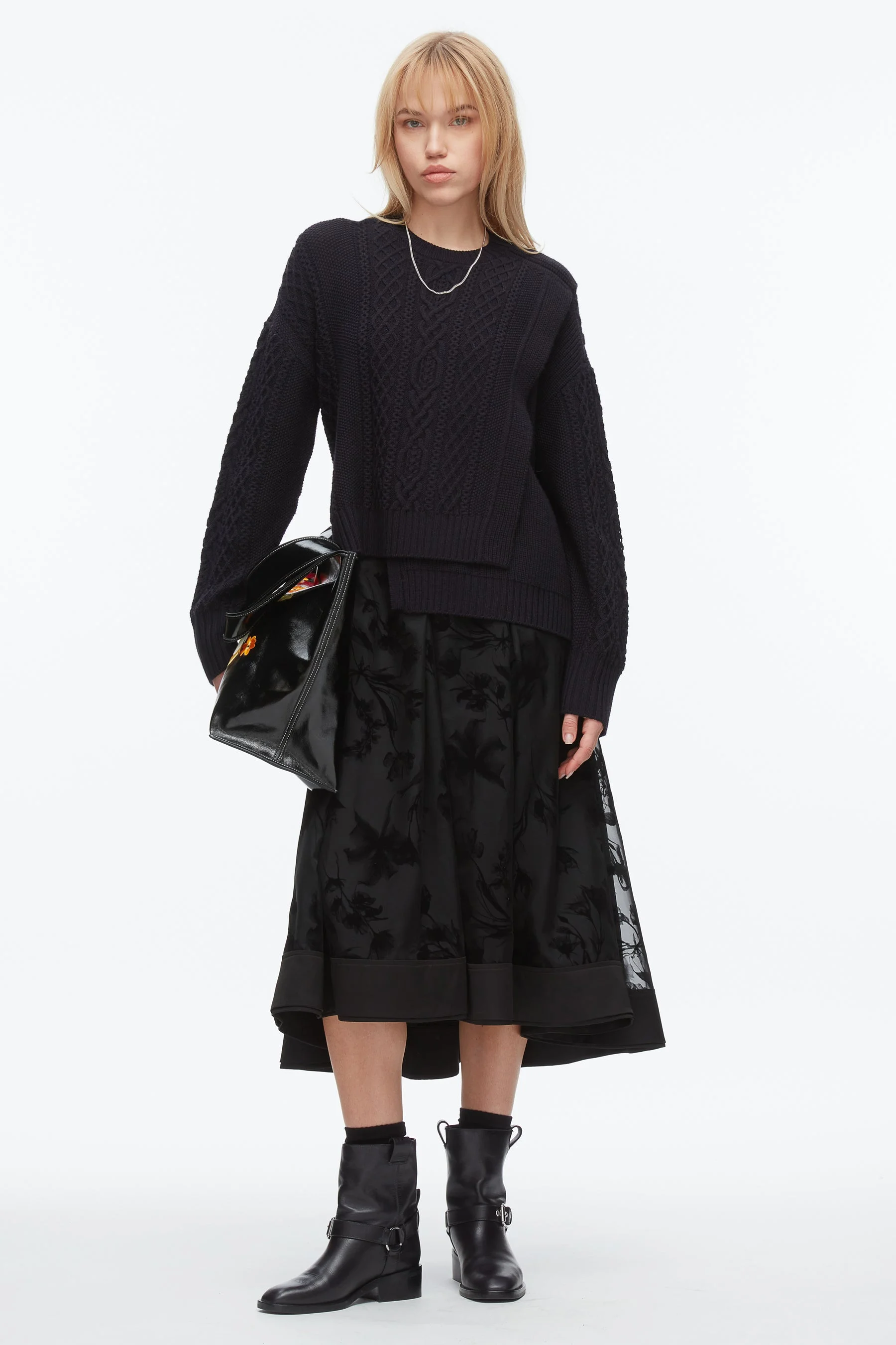 Classic with a twist. This crewneck cable sweater is knit from 100% extra fine merino wool, offering the perfect balance of warmth and breathability. A play of stitches—traditional cables and modern ribs—creates dimensional texture, while side slits and a stepped hem introduce ease and edge. Lightweight yet cozy, it’s a go-to knit that layers effortlessly from early fall through spring. Pair it with a leather mini or denim for feminine contrast. - 100% Wool - Model is 5'10', Bust: 30', Waist: 23', Hips: 34' and wearing a size 4 - Professional dry clean only