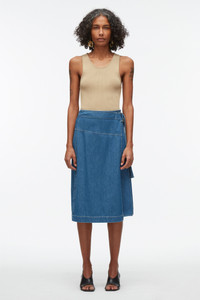 Casual spirit with a polished styling, this panel wrap skirt cut in Japanese chambray is a refreshing, lightweight take on a denim skirt. Box pleats on the side allow for movement while the waistband is anchored with a metal buckle. Wear with our knit tank for the ultimate off-duty uniform. - 100% Cotton - A-line - Professional dry clean only - Model Height: 5'10', Bust: 30', Waist: 23', Hips: 34' and wearing a size 4