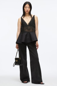 A delicate balance of structure and sensuality. This sheer chiffon peplum top is designed with a plunging V-neckline and intricate lace inserts that highlight its airy, ethereal quality. A soft flared hem adds volume, while the sheer back offers an alluring contrast. Layer over tonal separates for a romantic yet modern statement. - 100% Silk - Model is 5'10', Bust: 30', Waist: 23', Hips: 34' and wearing a size 4 - Professional dry clean only