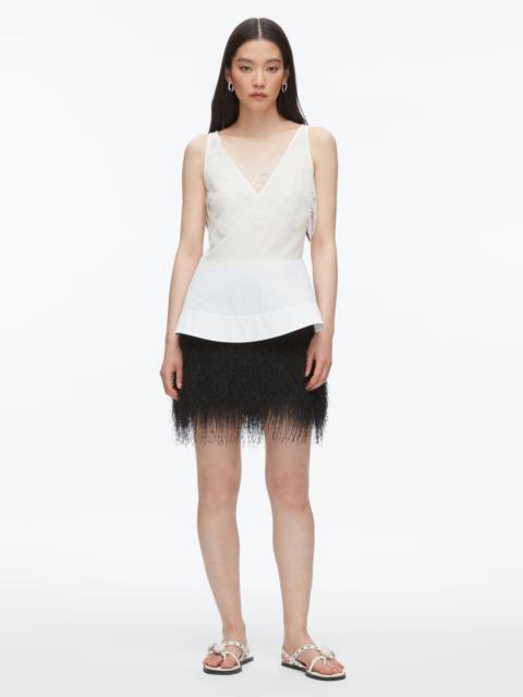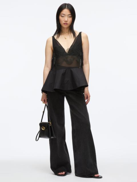 A delicate balance of structure and sensuality. This sheer chiffon peplum top is designed with a plunging V-neckline and intricate lace inserts that highlight its airy, ethereal quality. A soft flared hem adds volume, while the sheer back offers an alluring contrast. Layer over tonal separates for a romantic yet modern statement. - 100% Silk - Model is 5'10', Bust: 30', Waist: 23', Hips: 34' and wearing a size 4 - Professional dry clean only
