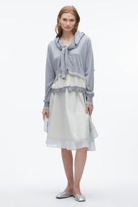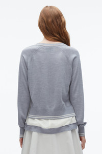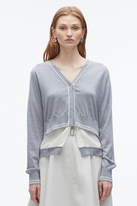 Crafted from luxurious lightweight merino wool, this cardigan takes cues from varsity sports and reimagines them with a romantic flair. Featuring contrast tipping and a sheer underlayer, it’s designed in our signature double-layer silhouette—a trompe l’oeil effect that creates the illusion of a perfectly styled pairing in one effortless piece. A V-neckline and ribbed cuffs nod to classic preppy codes, while the softly draped woven hem adds a delicate finish. Style it over airy skirts for an easy, elevated everyday uniform. - 100% Merino Wool - Model is 5'10', Bust: 30', Waist: 23', Hips: 34' and wearing a size 4 - Professional dry clean only
