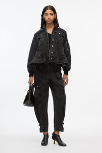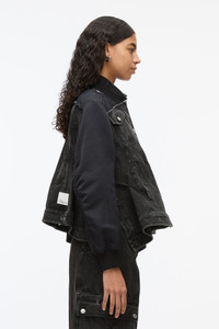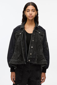 Taking familiar silhouettes and evolving them is core to design practice, and this hybrid jacket takes traditional denim trucker and inject with the feminine flourish of a flounce hem. Offsetting the romantic with the sleeve of a flight jacket in combo nylon. The silhouette is fashion forward cool, pair back with matching pants or wear with shirt dress for an off duty easy look. - 100% Cotton - Model is 5'10', Bust: 30', Waist: 23', Hips: 34' and wearing a size Small - Professional dry clean only