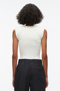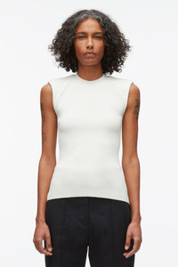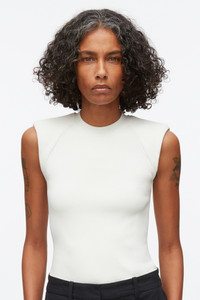 Knitted in a compact viscose rib, this slim top with a slightly padded shoulder is a foundational building block to any wardrobe. Sleek, sophisticated, and versatile, it is the New York uniform. - 73% Viscose 15% Polyester 11% Nylon 1% Elastane - Sleeveless - Mid length - Professional dry clean only - Model is 5'10', Bust: 30', Waist: 23', Hips: 34' and wearing a size Small