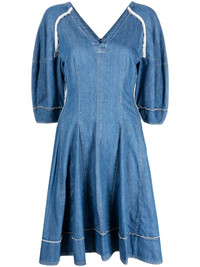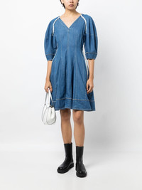 contrast-stitching V-neck dress Highlights - Indigo blue - Cotton - Denim - Contrast stitching - V-back - V-neck - Rear zip fastening - Short puff sleeves - Flared hem - Knee-length Imported Composition Cotton 100% SIZE & FIT Model measurements Height 5 ft 10 in(1.77 m) Bust/Chest 31.49 in(80 cm) Hips 35.43 in(90 cm) Waist 25.19 in(64 cm) FittingInformation Designed for a close fit at the chest and waist with a loose fit at the hip Made from a midweight non-stretch fabric, this piece offers minimal elasticity when worn This piece fits true to size – take your usual size Washing instructions Machine Wash