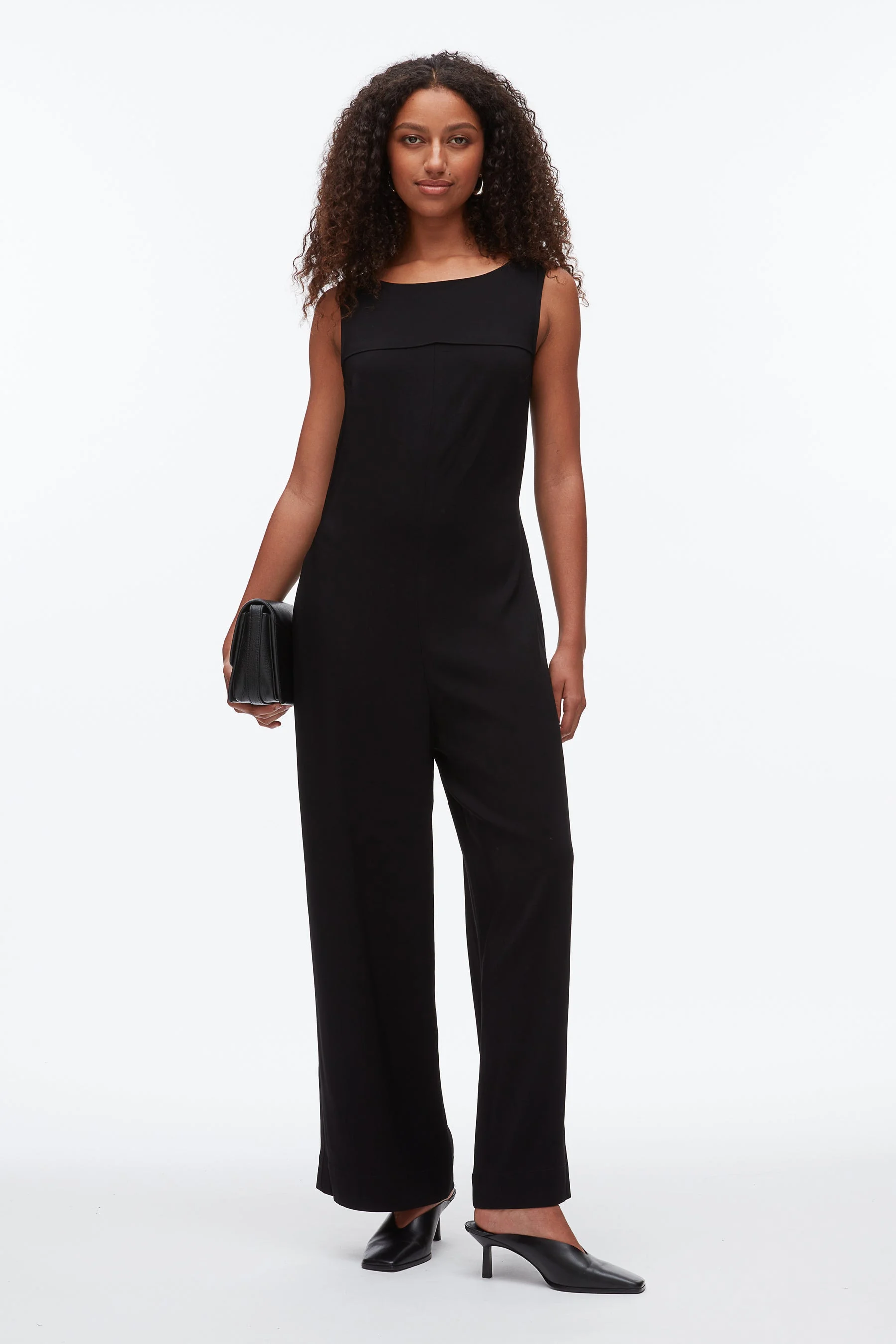 This sleek jumpsuit reimagines tailoring with ease and precision. Crafted from Italian stretch viscose crepe cady, it moves fluidly while maintaining structure—perfect for elevated dressing or polished everyday wear. The silhouette is streamlined through the body with subtle front seaming and a wide leg, while the back features crossover straps for a hint of unexpected detail. Pair it with heels for understated evening elegance or layer under a blazer for modern day polish. - 97% Viscose, 3% Elastane - Model is 5'10', Bust: 30', Waist: 23', Hips: 34' and wearing a size 4 - Professional dry clean only
