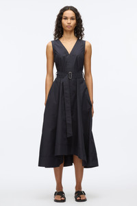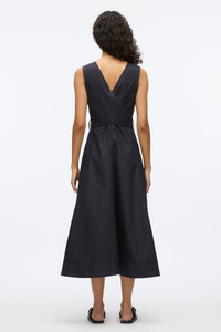 Crisp and refined, this V-neck dress is crafted from our signature technical poplin for is made for modern city dressing. Designed with a crisscross back detail and a cinched waist, it offers a flattering silhouette with a touch of unexpected elegance. The A-line skirt adds ease and movement, making it a versatile piece for warm-weather dressing. Style it with flat sandals for effortless daytime chic or elevate it with heeled mules for a polished finish. - 70% Cotton 30% Recycled Polyester - Model is 5'10', Bust: 30', Waist: 23', Hips: 34' and wearing a size 4 - Professional dry clean only