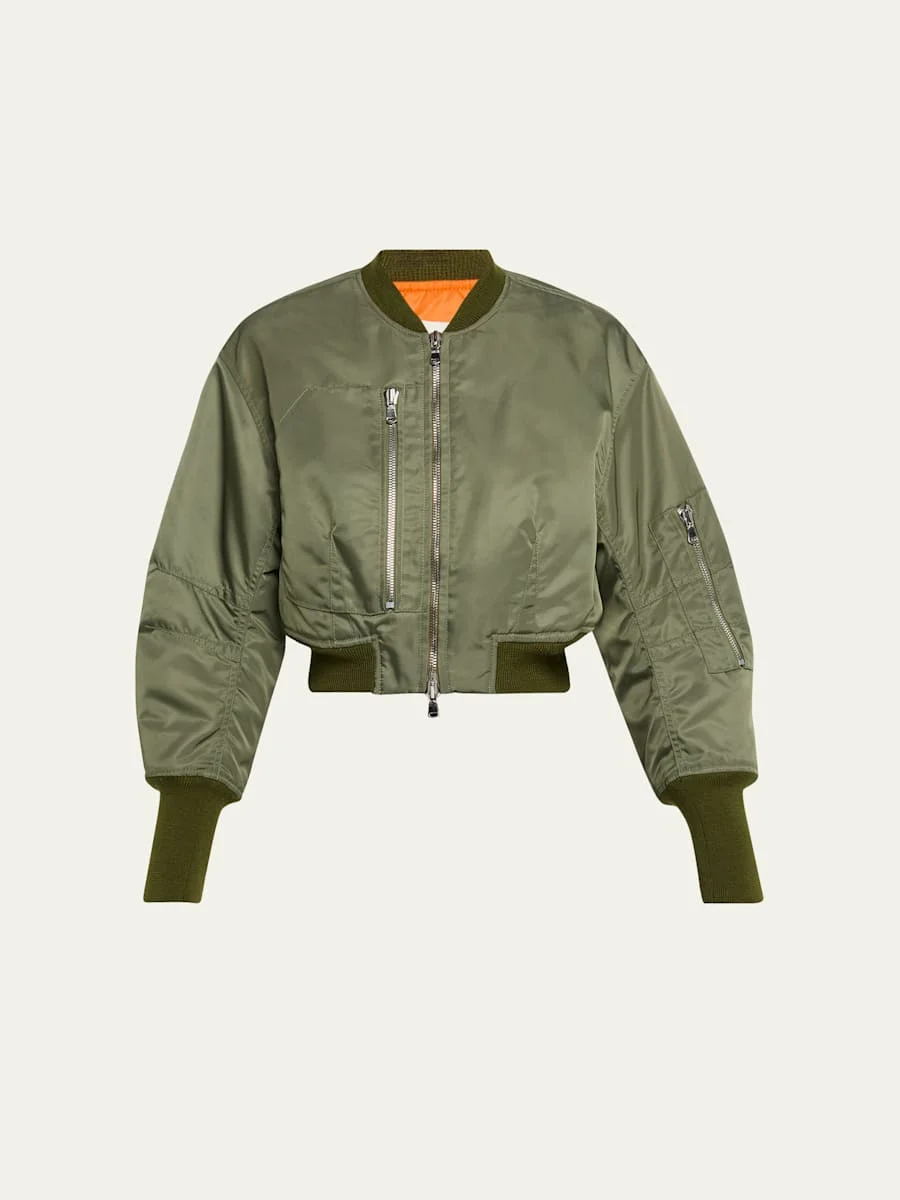 3.1 Phillip Lim bomber jacket finished with rib-knit trim Baseball collar Long voluminous sleeves; zip pocket on left sleeve Chest zip pocket Cropped fit Hem sits at the hip Two-way zip-front Nylon/polyamide Lining: Polyester Imported Online Inquiries: BGS21_T6Z1Q| Store Inquiries: #5071348