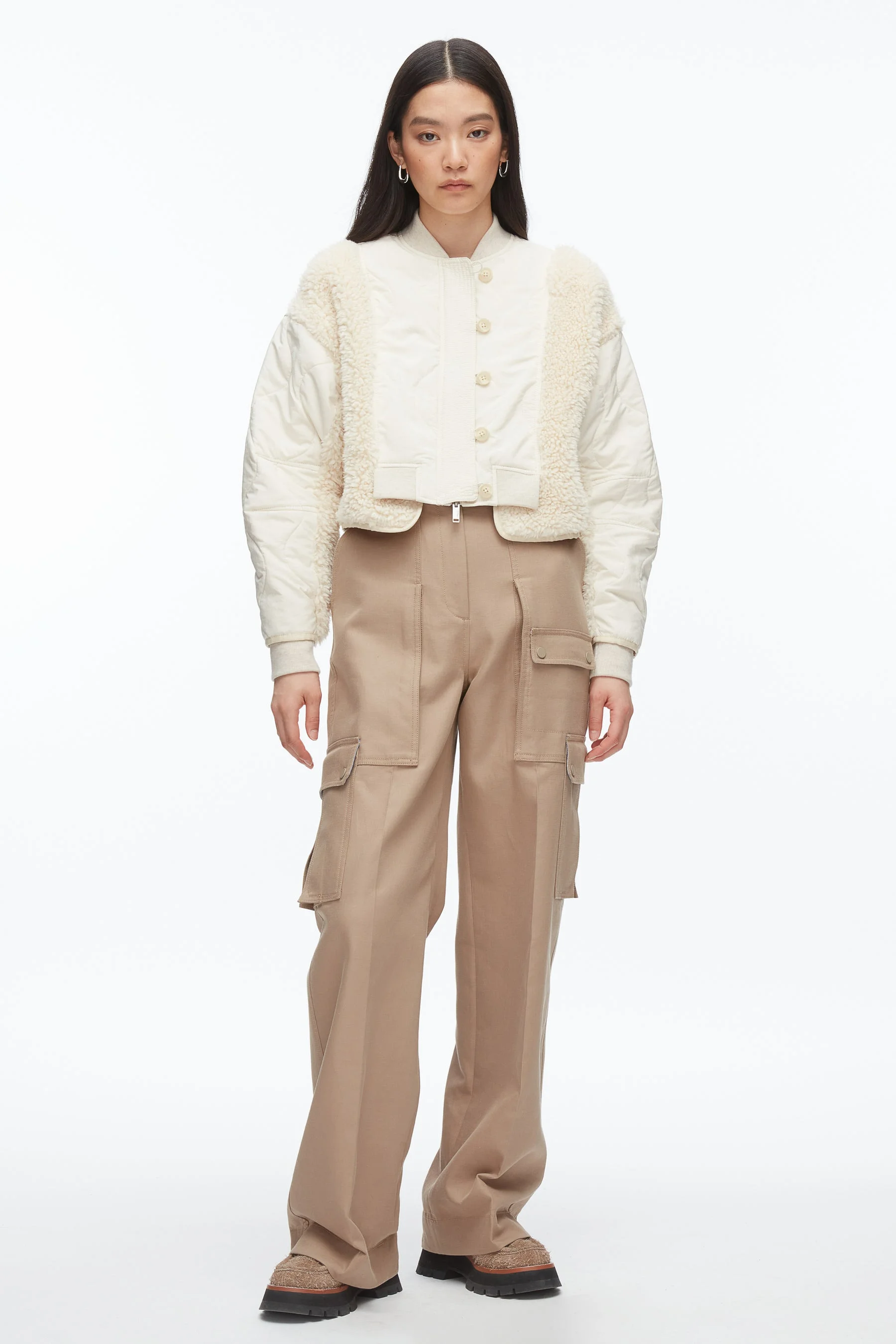 Combining plush sherpa fleece with quilted, padded recycled ripstop, this cropped bomber reimagines utilitarian outerwear with unexpected texture. A ribbed collar and buttoned placket nod to classic military liners, while the sculptural silhouette feels distinctly modern. Designed as an easy throw-on, it adds warmth to your everyday uniform—without sacrificing an ounce of style. - 100% Polyester - Model is 5'10', Bust: 30', Waist: 23', Hips: 34' and wearing a size 4 - Professional dry clean only