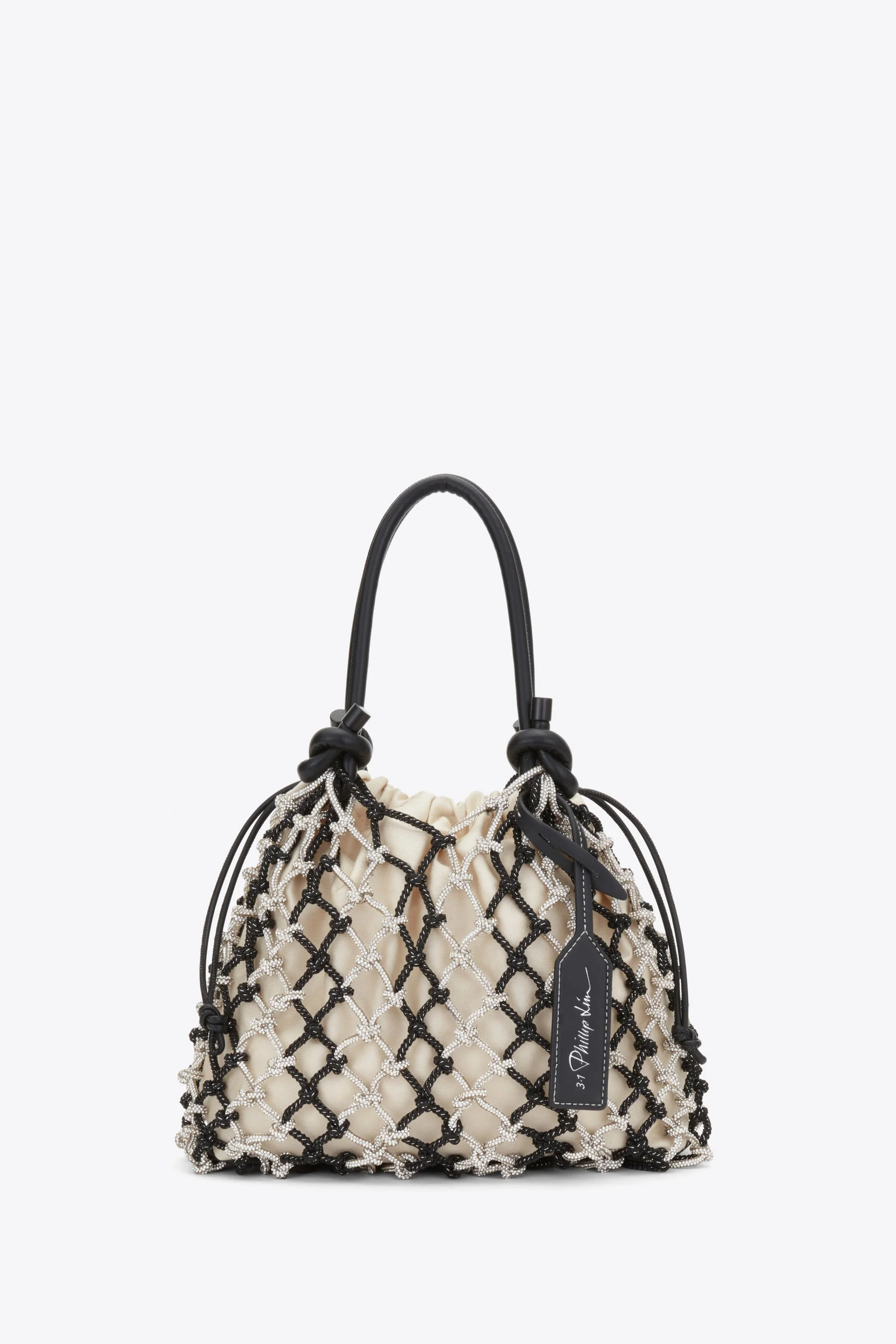 The Macrame Mini Sac combines a handwoven crystal and bungee cord macrame body with sleek faux leather handles. Inside, a removable cotton canvas drawstring pouch snaps neatly into place for secure, effortless carry. Lightweight yet structured, it’s the perfect grab-and-go piece—easy to wear from day to night, beach to city. - 25% Polyurethane, 25% Glass Crystal Polyurethane Chord, 50% Cotton - Lining: 100% Polyester - Height: 15" - Width: 11" - Depth: 4" - Handle Drop: 7''
