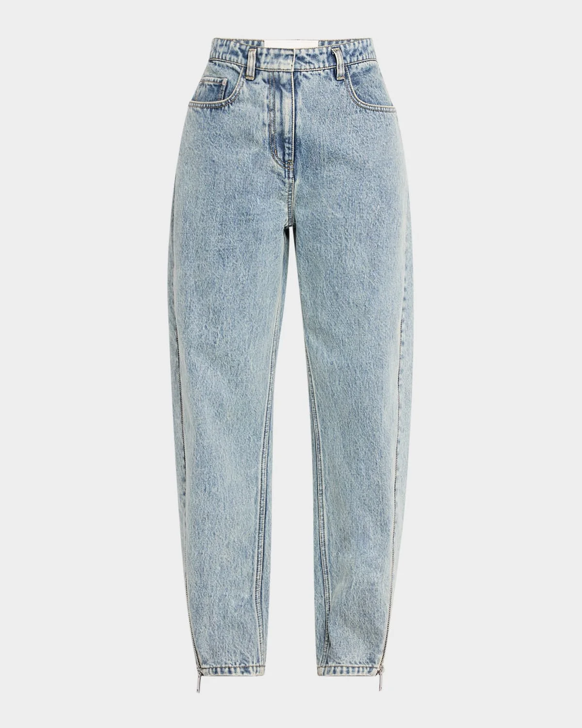 - 3.1 Phillip Lim curved-leg jeans featuring exposed side zips in light-wash denim - Approx. 12.3" rise; 30.25" inseam; 41" outseam - High rise - Five-pocket style - Relaxed, tapered fit - Full length - Button/zip fly; belt loops - Cotton - Dry clean - Imported