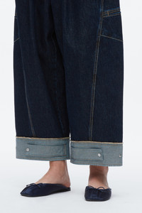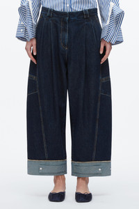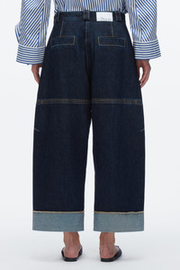A new silhouette for the season, these forward jeans fuse workwear roots with refined polish. Cut from lightweight denim and treated to a rich dark indigo wash, they offer a soft hand with structure. Double pleats and contrast topstitching sharpen the look, while an articulated curved leg and snap cuffs lend a design-forward edge. Cuff them high with flats or let them drape over heels—effortless versatility, tailored for city life. - 100% Cotton - Model is 5'10', Bust: 30', Waist: 23', Hips: 34' and wearing a size 4 - Professional dry clean only