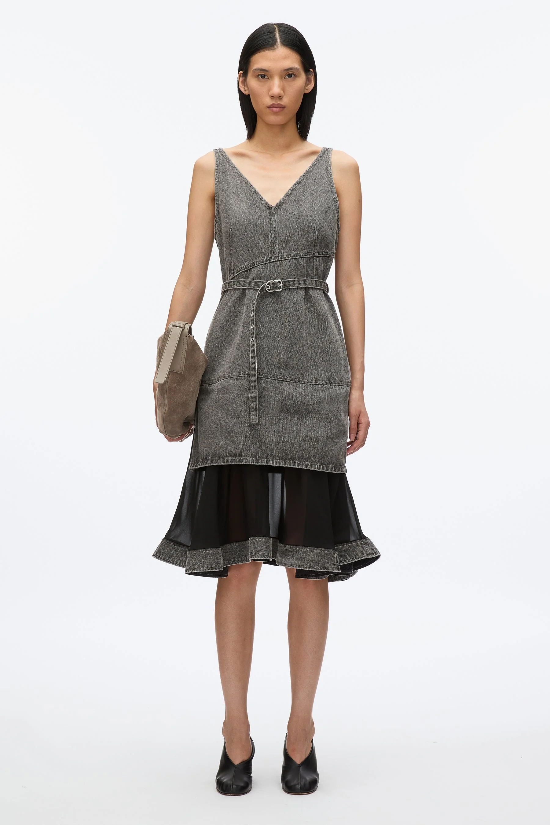 Playing with contrasts, this slip-inspired dress pairs utilitarian denim with a flouncy chiffon hem for a perfect blend of romance and New York edge. Finished with our signature hardware belt and a sleek zip-back entry, it redefines feminine dressing with a cool twist. - 100% Cotton - Model is 5'10', Bust: 30', Waist: 23', Hips: 34' and wearing a size Small - Professional dry clean only
