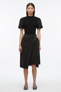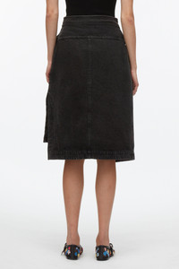 This A-line wrap silhouette falls to an asymmetric hem for a typically off-kilter feel. Stone and enzyme washed denim. Cinch the high-rise waist with the integrated belt. - 100% Cotton - A-Line - Professional dry clean only - Model is 5'10', Bust: 30', Waist: 23', Hips: 34' and wearing a size 4
