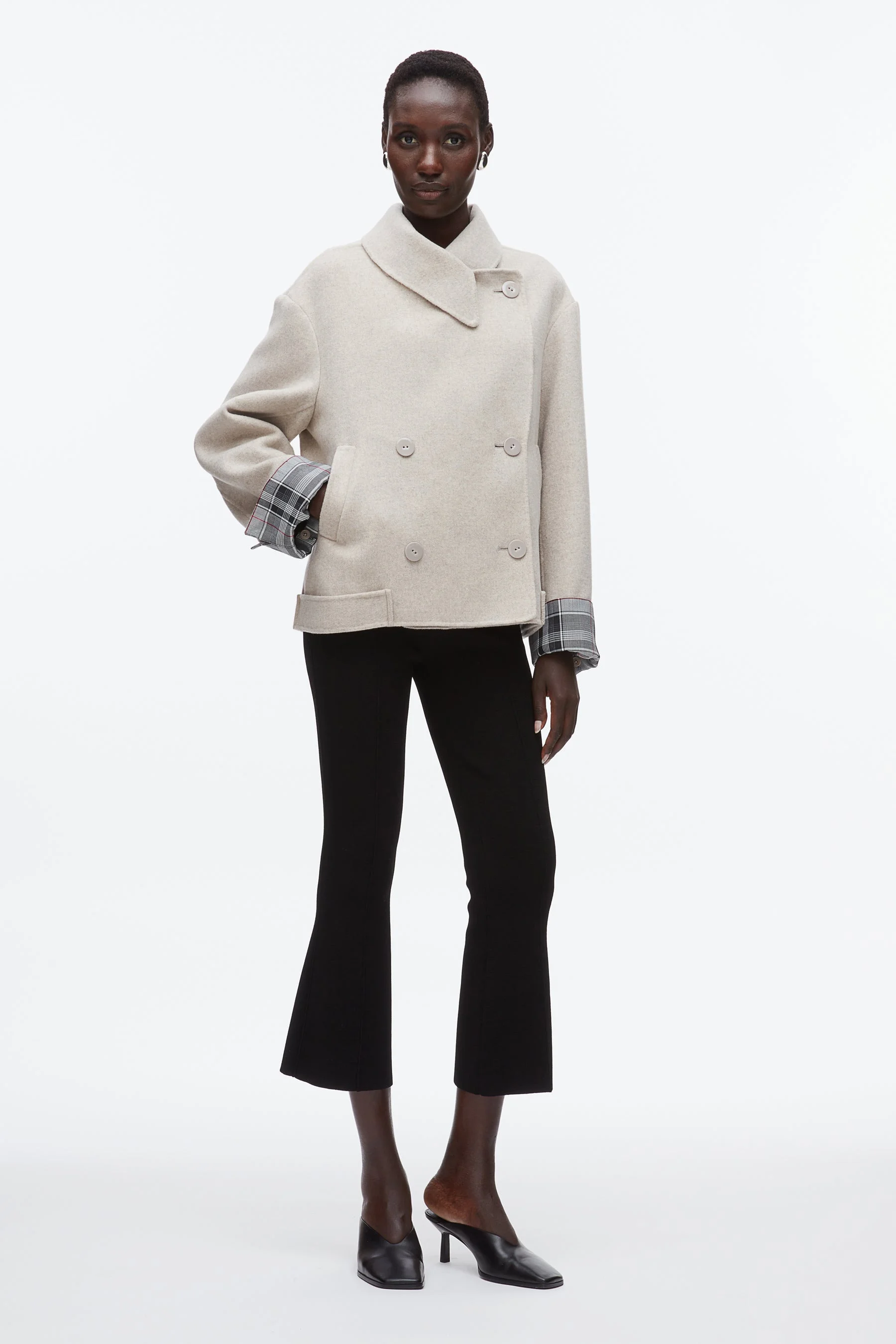 A modern reinterpretation of the classic peacoat, this cropped jacket is crafted from Italian double-face recycled wool. The silhouette is sharp yet relaxed, featuring an oversized collar and double-breasted front. Plaid wool accents lend quiet contrast, while the soft, lightweight construction provides warmth without the bulk. A responsible layer with timeless appeal and understated edge. - 100% Wool - Model is 5'10', Bust: 30', Waist: 23', Hips: 34' and wearing a size 4 - Professional dry clean only
