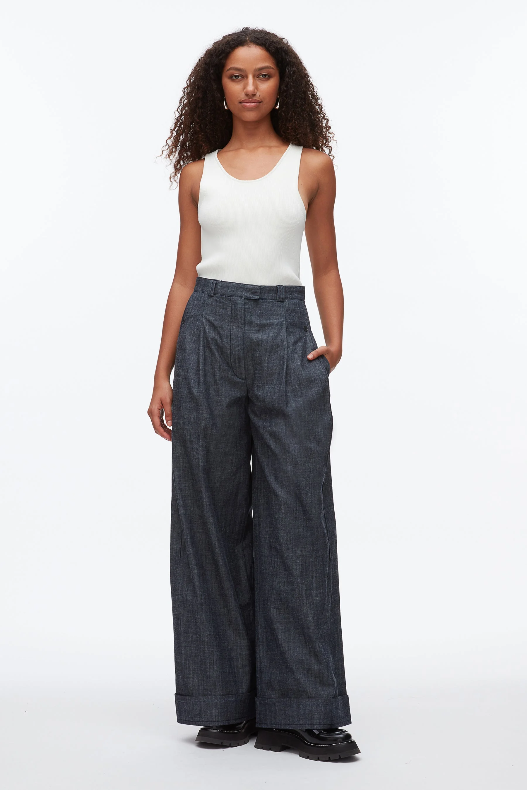 A modern take on tailored ease. Cut from lightweight chambray, these wide-leg trousers balance structure and fluidity with soft pleating through the front and a relaxed, full-length silhouette. A clean waistband and subtle utility-inspired back pocket refine the look, while the deep cuffed hem adds a grounded, architectural finish. A versatile staple that dresses up or down—pair with a ribbed tank for day or a sharp blazer for effortless polish. - 100% Cotton - Model is 5'10', Bust: 30', Waist: 23', Hips: 34' and wearing a size 4 - Professional dry clean only