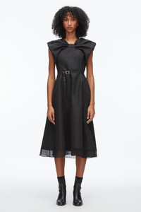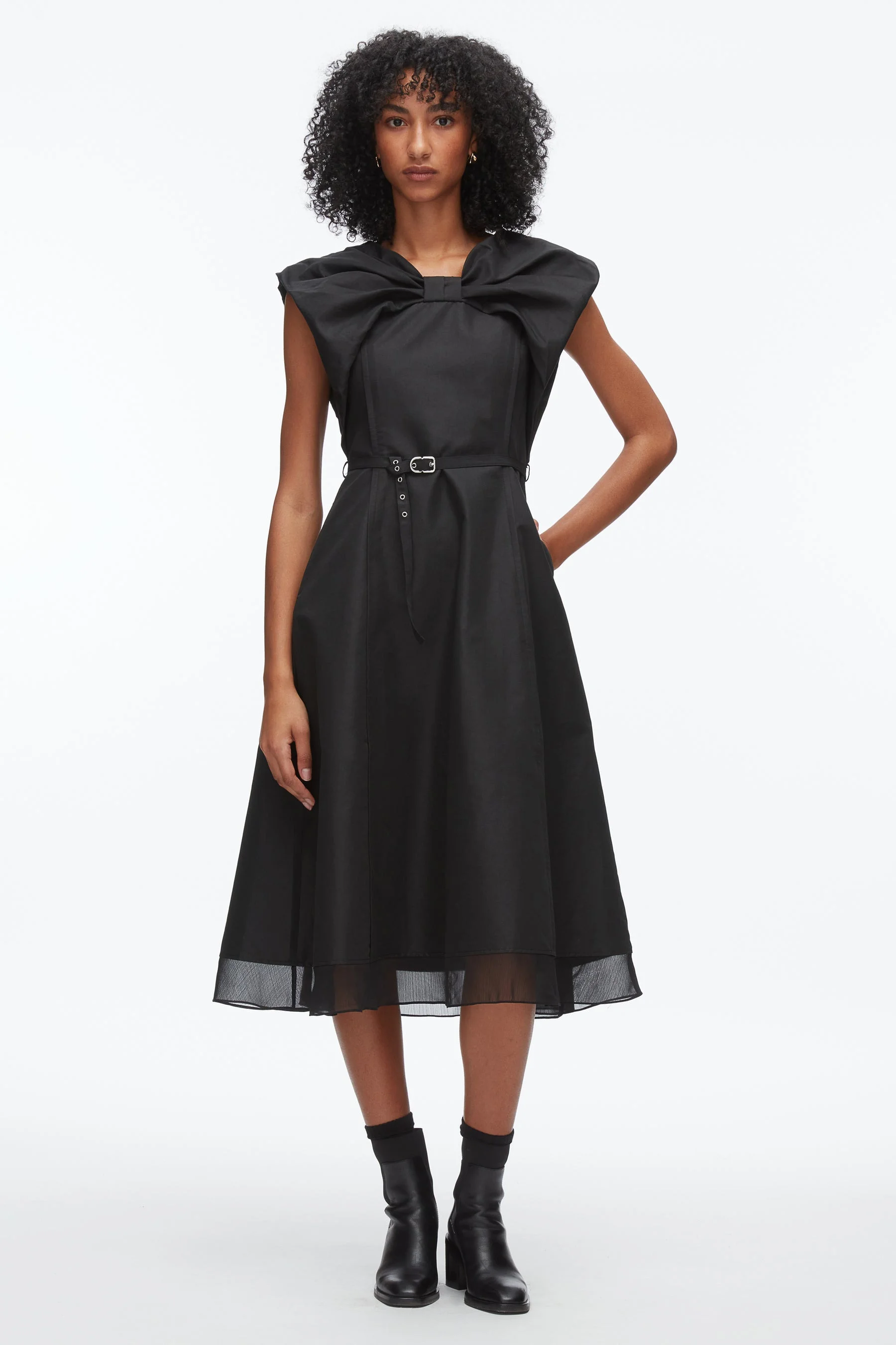 A bold twist on feminine dressing. Crafted in structured cotton-blend ottoman, this sleeveless midi dress is defined by its sculptural bow neckline and cinched waist with a grommet belt finished in our signature hardware. A sheer crinkle chiffon hem panel adds a layer of lightness, softening the architectural silhouette. Wear it with boots for daytime edge or strappy heels for after-dark drama. - 57% Cotton, 43% Polyester - Model is 5'10', Bust: 30', Waist: 23', Hips: 34' and wearing a size 4 - Professional dry clean only"