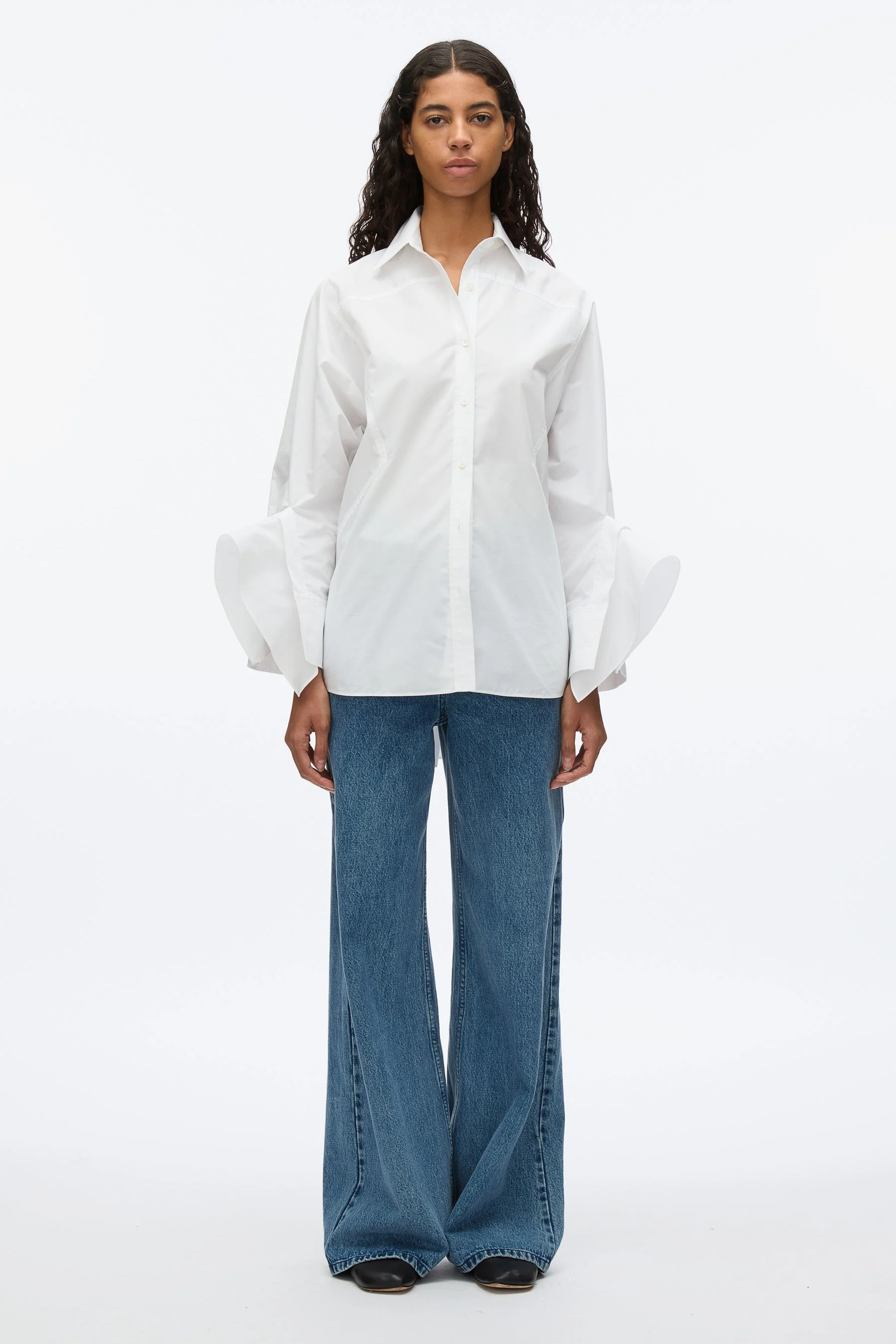 Our refreshed take on the oversized shirt with graphic cut lines is given a romantic lore with cascading ruffles inserted into the sleeve opening, heightening the classic silhouette to something much more alluring. Cut in our crisp poplin, style with our utility skirt for a cool versatile look. - 70% Cotton 30% Polyester - Long sleeve - Long length - Professional dry clean only - Model Height: 5'10', Bust: 30', Waist: 23', Hips: 34' and wearing a size Small