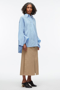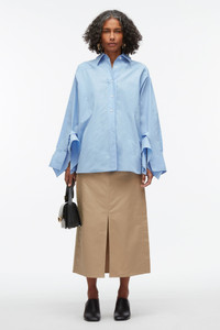 Our refreshed take on the oversized shirt with graphic cut lines is given a romantic lore with cascading ruffles inserted into the sleeve opening, heightening the classic silhouette to something much more alluring. Cut in our crisp poplin, style with our utility skirt for a cool versatile look. - 70% Cotton 30% Polyester - Long sleeve - Long length - Professional dry clean only - Model Height: 5'10', Bust: 30', Waist: 23', Hips: 34' and wearing a size Small