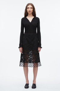 Equal parts delicate and daring, this midi skirt channels ‘90s joie de vivre and the joy of dressing up. Crafted from corded lace on a fine mesh base, it’s finished with a floral-beaded sheer panel that peeks out at the hem—adding texture, depth, and a quiet kind of drama. Feminine with an edge, it pairs effortlessly with a soft knit or layered with a draped top and blazer for a polished dinner look. A wardrobe anchor for modern romance, styled your way. - 100% Polyester - Model is 5'10', Bust: 30', Waist: 23', Hips: 34' and wearing a size 4 - Professional dry clean only