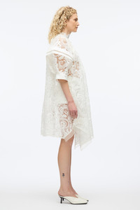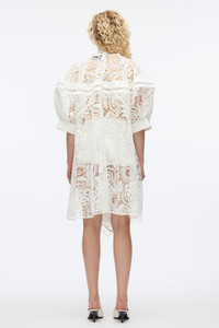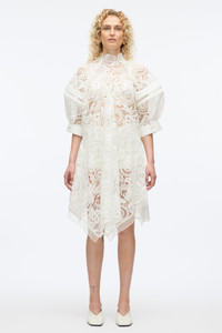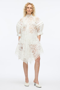 High impact juxtaposition of romance and structure, this lace dress redefines modern femininity. Cut from intricate corded lace with voluminous sleeves and sporty mesh inserts, it balances ethereal softness with architectural edge. A high neckline and handkerchief hem add drama, while sheer elements invite an alluring contrast. Style it with our ID mules and a ID clutch for a striking evening look. - 100% Polyester - Model is 5'10', Bust: 30', Waist: 23', Hips: 34' and wearing a size 4 - Professional dry clean only