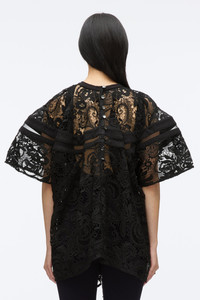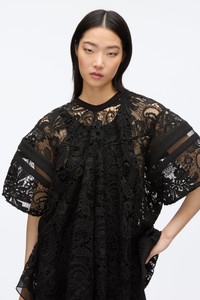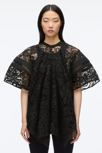 Romanticism with a New York edge. This voluminous top takes cues from the bold proportions of sports jerseys, reimagined in delicate corded lace. Sheer femininity meets graphic contrast with a structured collar and mesh inserts that add a touch of sporty dynamism. Pair it with our compact rib flare pants for a modern take on effortless glamour. Center back button closure. - 100% Polyester - Model is 5'10', Bust: 30', Waist: 23', Hips: 34' and wearing a size 4 - Professional dry clean only