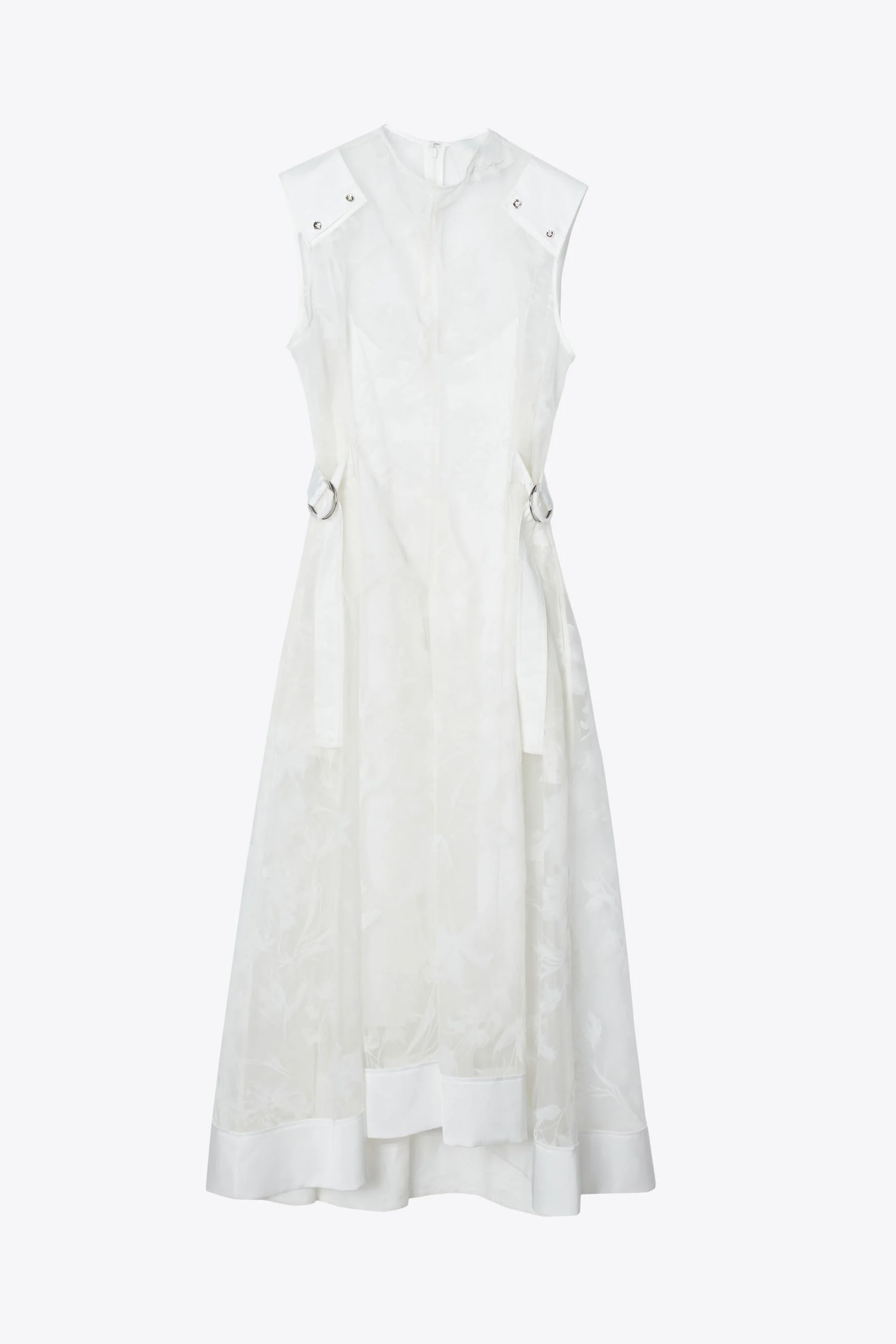 Dark romance meets utilitarian edge. This sleeveless dress is crafted in sheer devore organza with tonal floral motifs, framed in sleek satin trim throughout. Shoulder epaulets and metal button details add a touch of attitude, while the belted waist and high-low hem create a sculpted, airy silhouette. Comes with a matching slip for effortless coverage. Feminine with a twist—perfect for modern occasion dressing. - 100% Polyester - Model is 5'10', Bust: 30', Waist: 23', Hips: 34' and wearing a size 4 - Professional dry clean only