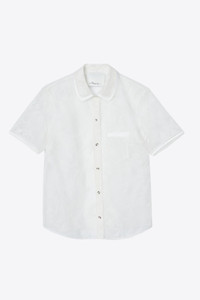 An everyday staple with elevated edge. This short sleeve button-down is crafted from sheer Japanese organza with a flocked floral motif—lightweight, airy, and endlessly versatile. The relaxed fit and satin trim details make it easy to dress up or pare back. Whether layered over a tank with denim or styled with tailored trousers, it moves effortlessly from day to night with a quiet kind of polish. - 100% Polyester - Model is 5'10', Bust: 30', Waist: 23', Hips: 34' and wearing a size 4 - Professional dry clean only